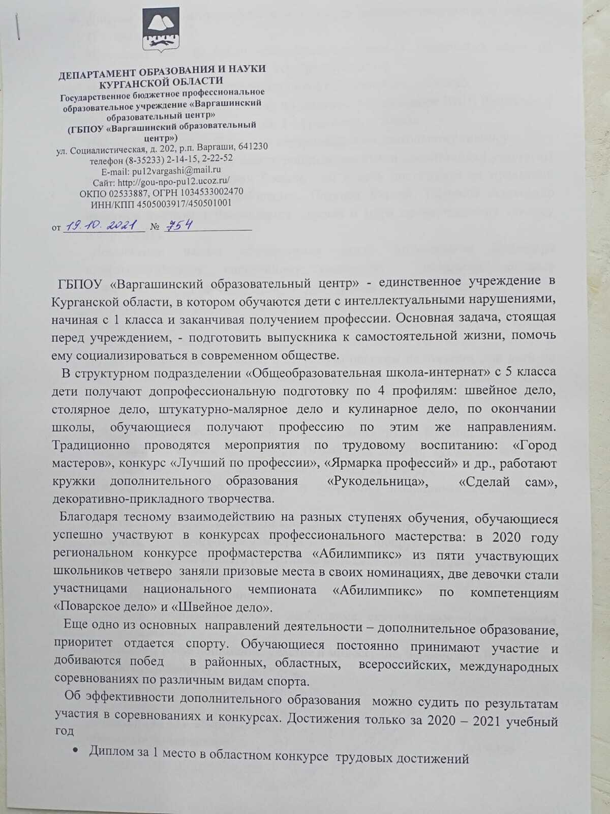 ГБПОУ «Варгашинский образовательный центр» - единственное учреждение в Курганской области, в котором обучаются дети с интеллектуальными нарушениями, начиная с 1 класса и заканчивая получением профессии.